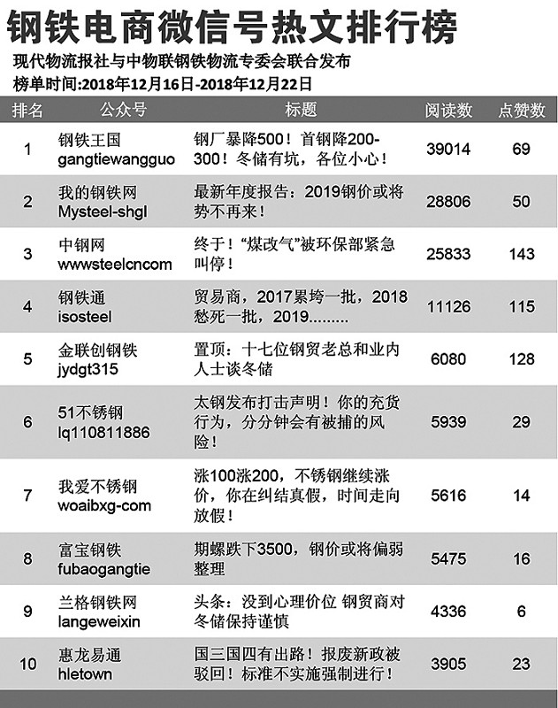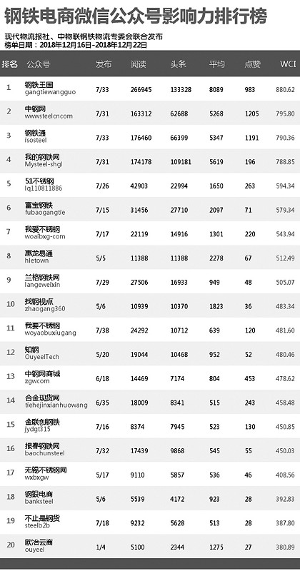 钢铁行业“钢铁电商微信公众号影响力排行榜”由现代物流报社、中物联钢铁物流专业委员会联合发布。