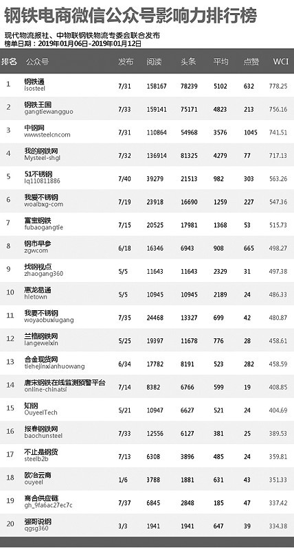 钢铁行业“钢铁电商微信公众号影响力排行榜”由现代物流报社、中物联钢铁物流专业委员会联合发布。