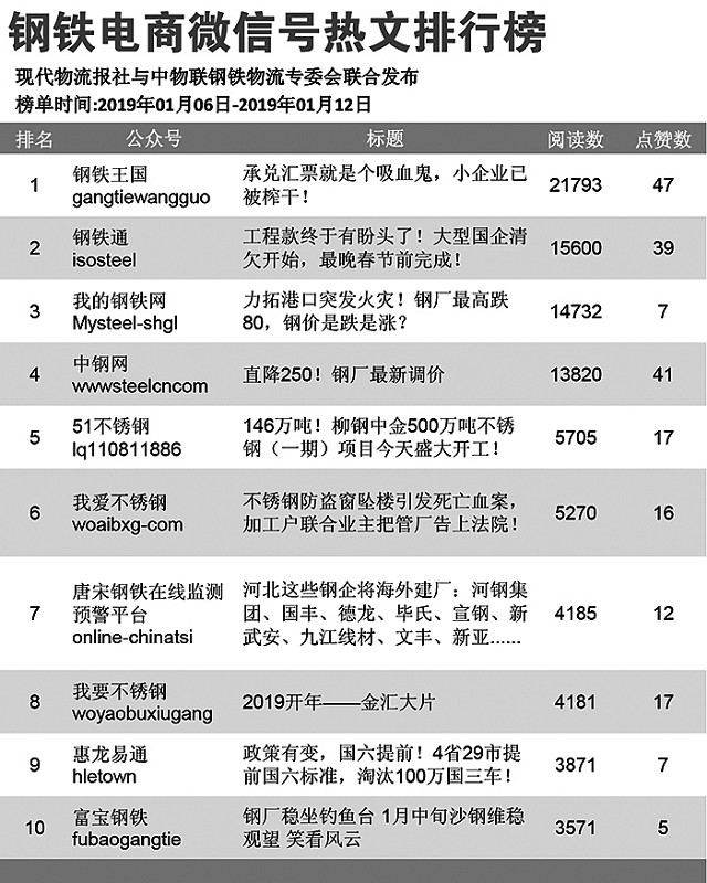 本周的热文排行榜,“钢铁王国”发布的“承兑汇票就是个吸血鬼,小企业已被榨干!”一文以21793的阅读数成为榜首;“我爱不锈钢”发布的一篇由产品引发事故的文章也被广泛关注。