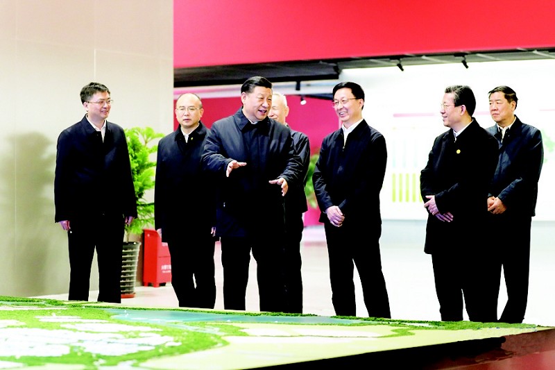 图为习近平在市民服务中心,听取雄安新区总体规划、政策体系及建设情况介绍。