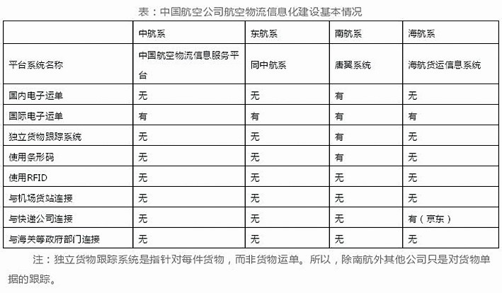 国内快递公司和零担物流都已实现的货物追踪查询功能,航司中只有南航一家应用条形码技术真正实施货物跟踪。缺乏新技术应用成为航空物流信息化的瓶颈之一。