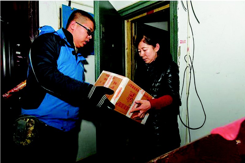 图为呼和浩特中通快递新华东街分部的快递员程泓毅正将快递送到客户手中。
