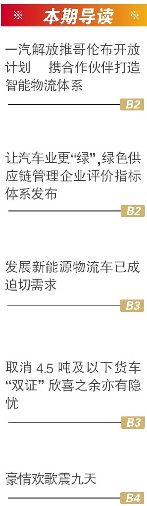 一汽解放推哥伦布开放计划 携合作伙伴打造智能物流体系B2让汽车业更“绿”,绿色供应链管理企业评价指标体系发布B2发展新能源物流车已成迫切需求B3取消4.5吨及以下货车“双证”欣喜之余亦有隐忧B3豪情欢歌震九天B4