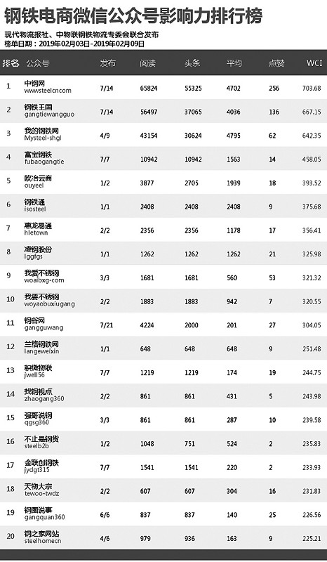 钢铁行业“钢铁电商微信公众号影响力排行榜”由现代物流报社、中物联钢铁物流专业委员会联合发布。