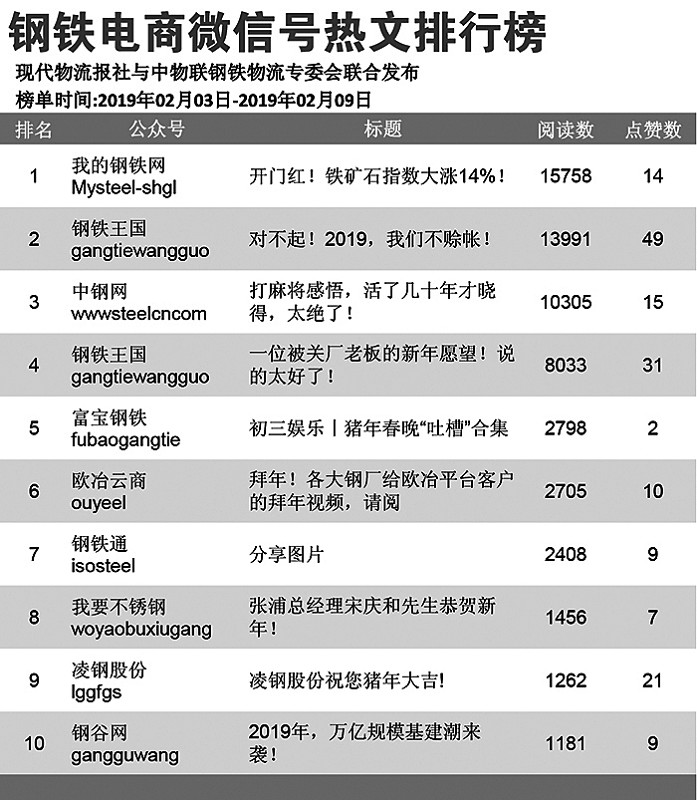 本周的热文排行榜,“我的钢铁网”发布的“开门红!铁矿石指数大涨14%!”一文以15758的阅读数成为榜首;本期热文榜单少了钢市行情类文章,多为新春拜年内容。