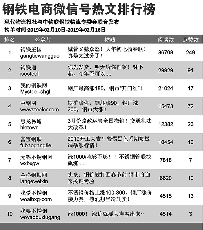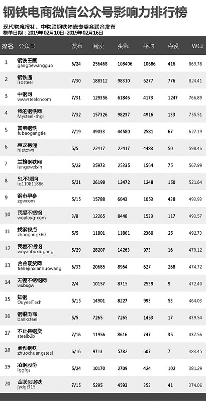 钢铁行业“钢铁电商微信公众号影响力排行榜”由现代物流报社、中物联钢铁物流专业委员会联合发布。