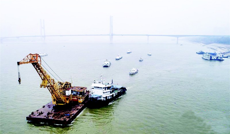 图为在武汉长江、汉江核心区港口码头岸线资源优化调整启动仪式现场,执法艇将趸船拖离,前往船厂报废。