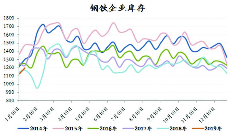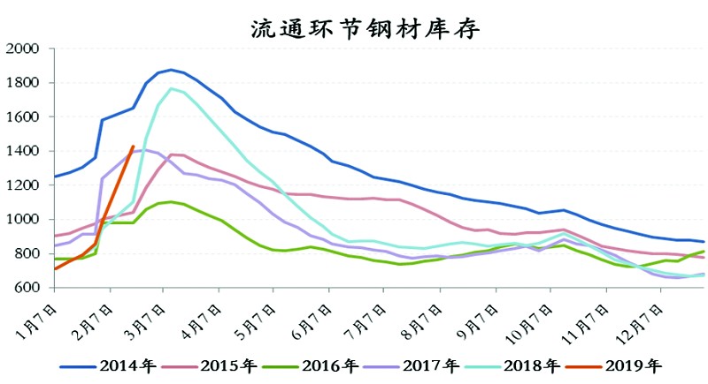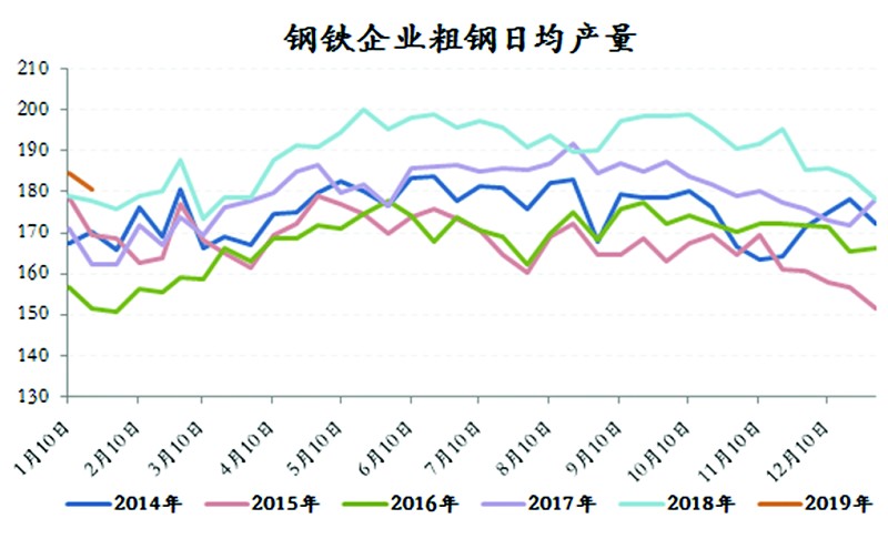 从我们监测的钢铁企业产存情况看,在2018年高产的基础上,今年1月以来重点大中型钢铁企业粗钢日均产量基本维持在180万吨左右,较往年有明显增长。而钢铁企业厂内库存则维持近年来较低水平,与去年同期接近。春节期间,钢铁企业库存增量低于预期,其中建材品种库存略升,板材品种库存略降。