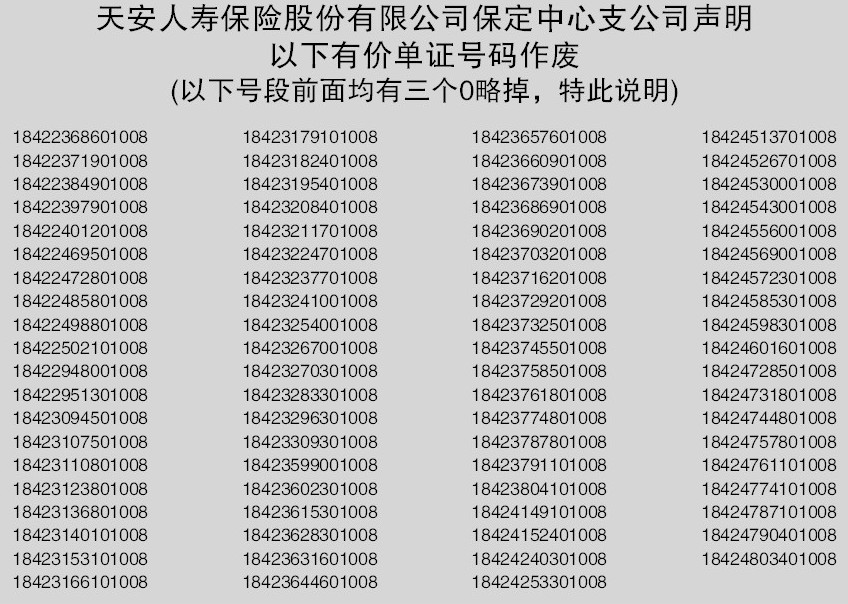 天安人寿保险股份有限公司保定中心支公司声明以下有价单证号码作废