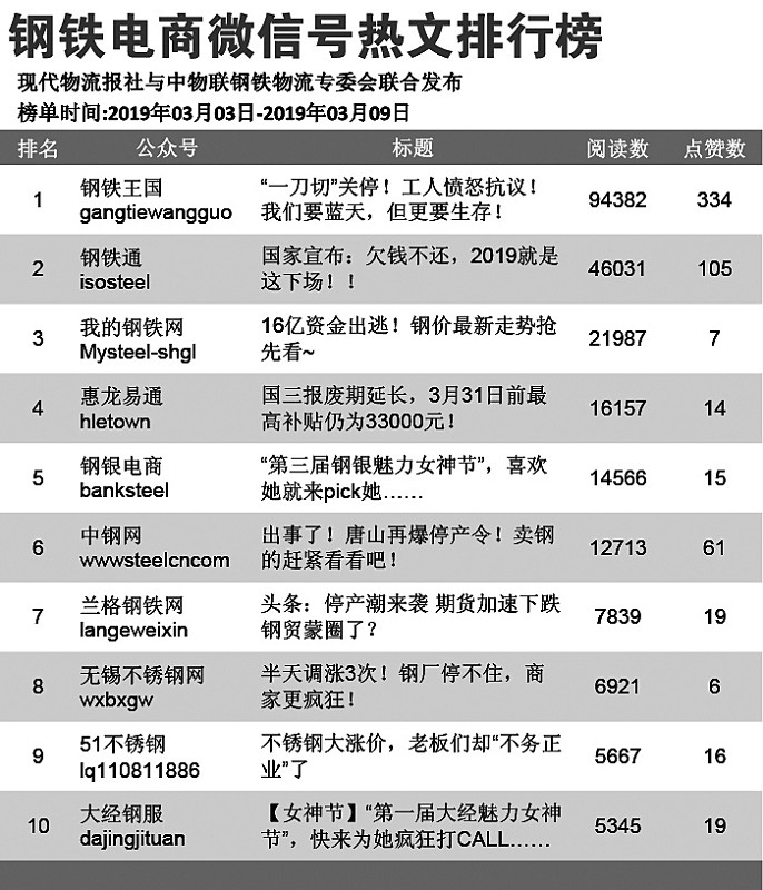 钢铁行业“钢铁电商微信公众号影响力排行榜”由现代物流报社、中物联钢铁物流专业委员会联合发布。