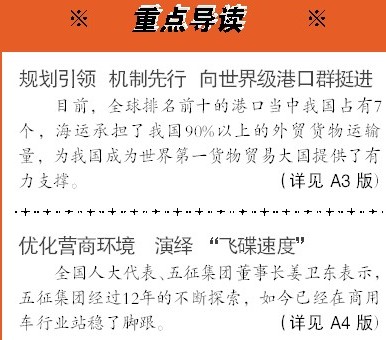 规划引领 机制先行 向世界级港口群挺进 目前,全球排名前十的港口当中我国占有7个,海运承担了我国90%以上的外贸货物运输量,为我国成为世界第一货物贸易大国提供了有力支撑。 (详见A3版)优化营商环境 演绎 “飞碟速度” 全国人大代表、五征集团董事长姜卫东表示,五征集团经过12年的不断探索,如今已经在商用车行业站稳了脚跟。 (详见A4版)