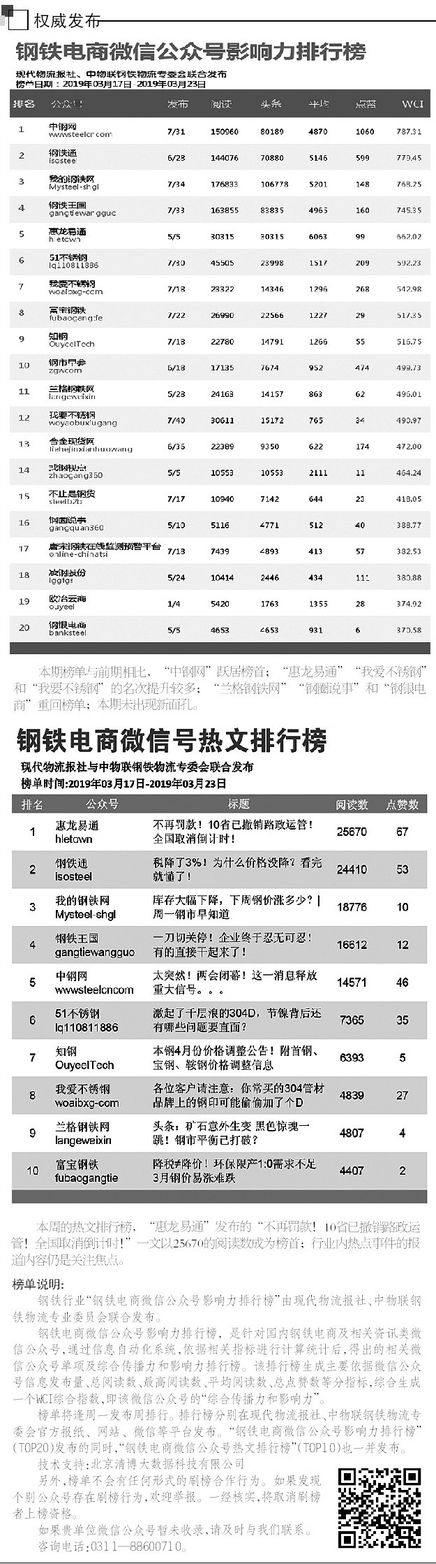 钢铁行业“钢铁电商微信公众号影响力排行榜”由现代物流报社、中物联钢铁物流专业委员会联合发布。