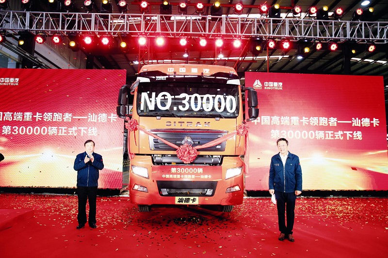 本报讯 (记者 何文忠 任宏) 4月1日12时08分,随着中国重汽党委书记、董事长谭旭光“下线”号令落地,中国重汽集团第30000辆汕德卡披红挂彩驶下生产线,标志着国内高端重卡迈上了一座新的里程碑。