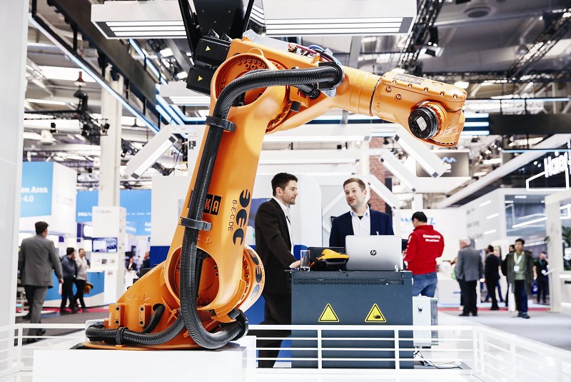 新工业浪潮里,一些中国企业勇立潮头,在云计算、大数据、物联网等领域持续创新,其中的佼佼者不仅已有能力比肩西方同行业的领军企业,在5G、人工智能等领域甚至实现局部“领跑”。瑞士工业巨头ABB集团首席执行官史毕福对中国积极推动工业发展、大力使用人工智能提高生产力的势头表示赞赏。图为汉诺威工博会华为展区展出的机械臂。(新华社记者单宇琦摄)