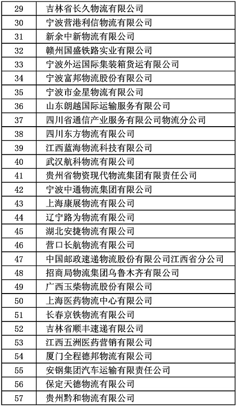 为落实国家发改委经济运行局《关于协助开展物流行业信用建设工作的函》中有关建立行业“红名单”标准的要求,我会依据《物流行业守信典型企业评价标准》及《“物流行业守信典型企业”评价工作管理办法》,按照申报、初审、数据筛查、审定、公示等规范评估流程,坚持公平、公开、公正原则,根据企业的登记类信息、公共信用记录、行业信用记录三个方面情况,开展了首批物流行业守信典型企业评价工作。本次共审定通过首批物流行业守信典型企业57家。根据评估流程要求,公示期已满,无异议,现一并予以通告。中国物流与采购联合会二〇一九年四月三日