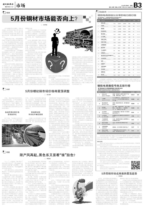 □ 曾节胜 4月份钢铁需求在增长,供给也在增长,供需总体平衡,预计5月份这种状况还会持续。5月份,整个...