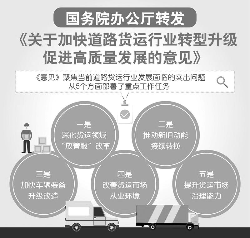 近日,国务院办公厅转发交通运输部等部门《关于加快道路货运行业转型升级促进高质量发展的意见》 (以下简称《意见》)。《意见》指出,要以习近平新时代中国特色社会主义思想为指导,全面贯彻党的十九大和十九届二中、三中全会精神,牢固树立和贯彻落实新发展理念,以供给侧结构性改革为主线,加快建设安全稳定、经济高效、绿色低碳的道路货运服务体系,促进道路货运行业高质量发展。《意见》聚焦当前道路货运行业发展面临的突出问题,从5个方面部署了14项重点工作任务。