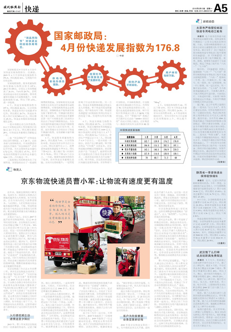 □中新 图标:中国快递发展指数 国家邮政局9日发布4月份中国快递发展指数报告。经测算,2019年4月中国...