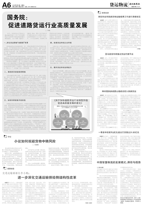 □ 平凡 近日,国务院办公厅转发交通运输部等部门《关于加快道路货运行业转型升级促进高质量发展的意见》...