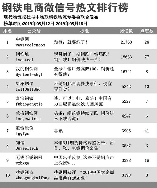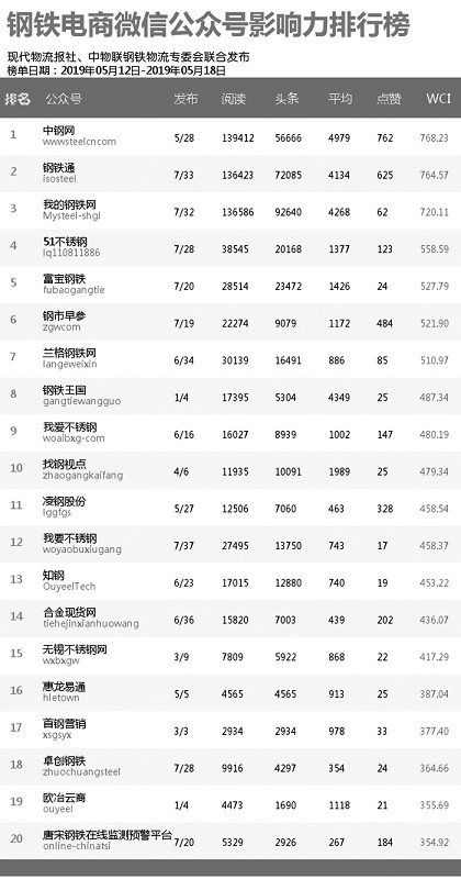 钢铁行业“钢铁电商微信公众号影响力排行榜”由现代物流报社、中物联钢铁物流专业委员会联合发布。