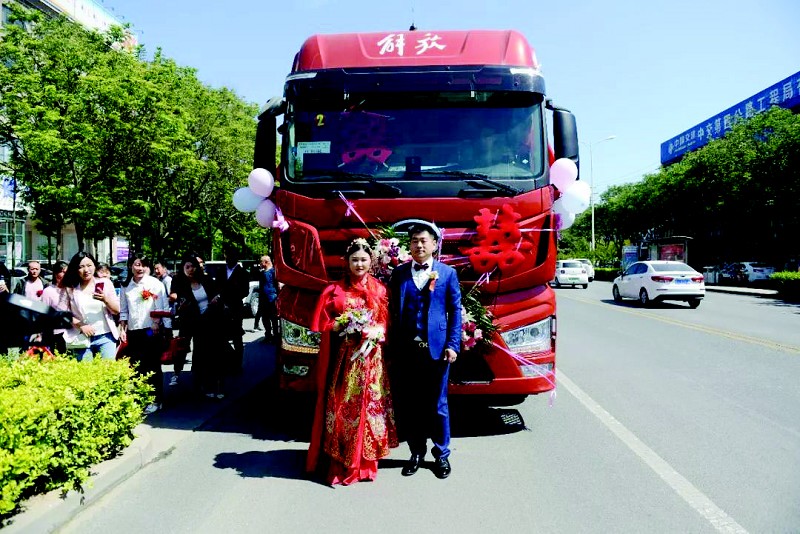 当车辆抵达迎娶新娘的宾馆门口,一字排开的“解放”又一次成为了周围夺睛的焦点。见到记者拍照,一位60多岁的老大爷说:“乖乖,还是这个气派!”“让我也试试,来,照个相!”新郎新娘的亲友团,纷纷的登上迎亲的“解放”婚车,体会一下“居高临下”的感觉。“作为濮阳天亿(解放濮阳经销商)的员工,结婚用解放,很霸气和自豪!”在接受《现代物流报》记者独家专访时,来自濮阳市天亿汽车销售服务有限公司的新郎刘利伟很兴奋。“这样的婚车与众不同,很另类和霸气!我很开心!”新娘郭晓路笑容绽放,并和新郎快乐地在“解放”婚车前合影留念。“我开了这么多年的车,也是第一次开解放牵引车迎娶新娘,激动!”婚车的驾驶员马彦涛面对记者的采访,一脸喜悦。