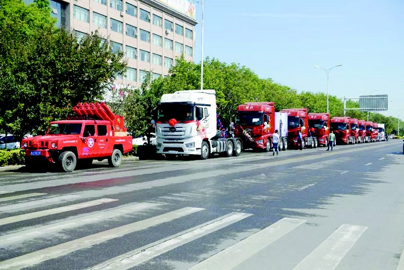 8点58分,礼花飘飞,在一阵响亮的炮仗声中,由10辆崭新的“解放”牵引车组成的迎亲车队缓缓启程。车队首尾各是一辆白色的“解放J7”,中间分别为4辆红色的“解放J7”和4辆“解放JH6”。“啧啧,这车队真拉风!”“在濮阳还是第一次见,得劲!”