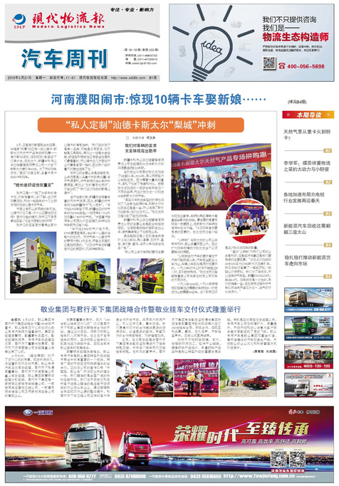 本报讯 5月22日,敬业集团与君行天下集团战略合作暨100台陕汽重卡、敬业挂车交付仪式在河北敬业专用汽车院...