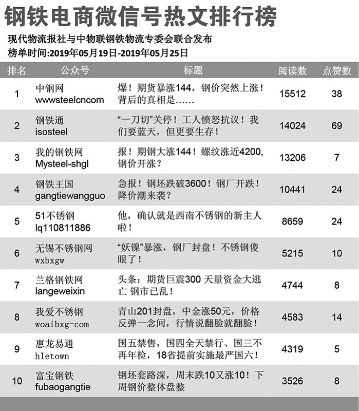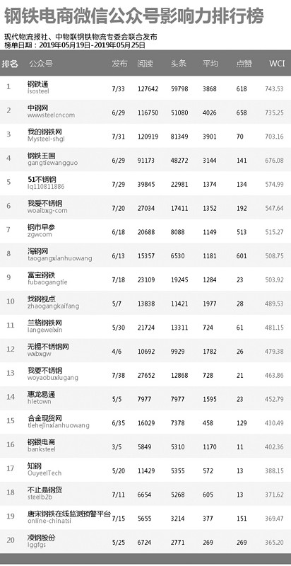 钢铁行业“钢铁电商微信公众号影响力排行榜”由现代物流报社、中物联钢铁物流专业委员会联合发布。