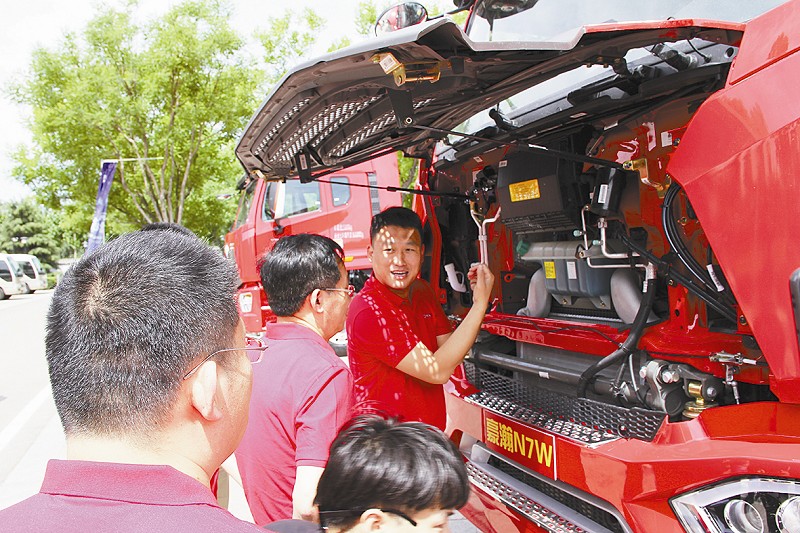 在展车面前,中国重汽集团销售部市场发展管理部经理李海龙向客户介绍新品的种种优势:“豪瀚N7W/N5W驾驶室全面升级,由意大利著名设计公司研发设计,造型注重低风阻设计,每一部件均经过风阻设计分析,风阻系数低;整车轻量化设计,匹配轻量化的WP10H发动机。”