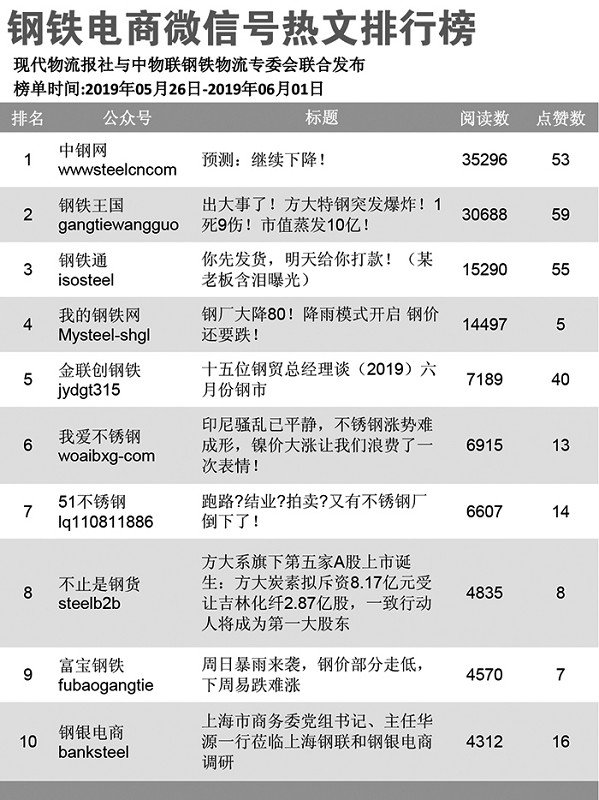 钢铁行业“钢铁电商微信公众号影响力排行榜”由现代物流报社、中物联钢铁物流专业委员会联合发布。