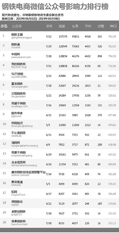 钢铁行业“钢铁电商微信公众号影响力排行榜”由现代物流报社、中物联钢铁物流专业委员会联合发布。