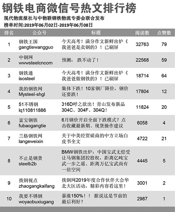 本周的热文排行榜,“钢铁王国”发布的“今天高考!满分作文新鲜出炉《我爸爸是卖钢的》!已刷屏”一文以32763的阅读数排在榜首;“中钢网”发布的钢市行情预测类文章亦得到广泛关注。