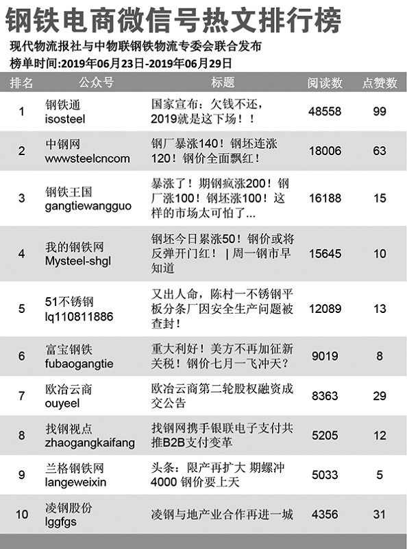 本周的热文排行榜,“钢铁通”本周发布的与上周“钢铁王国”发布的相同的文章——“国家宣布:欠钱不还,2019就是这下场!!”一文以48558的阅读数排在榜首,再次成为人们广泛关注的内容;钢市价格行情消息的发布亦得到大家关注。