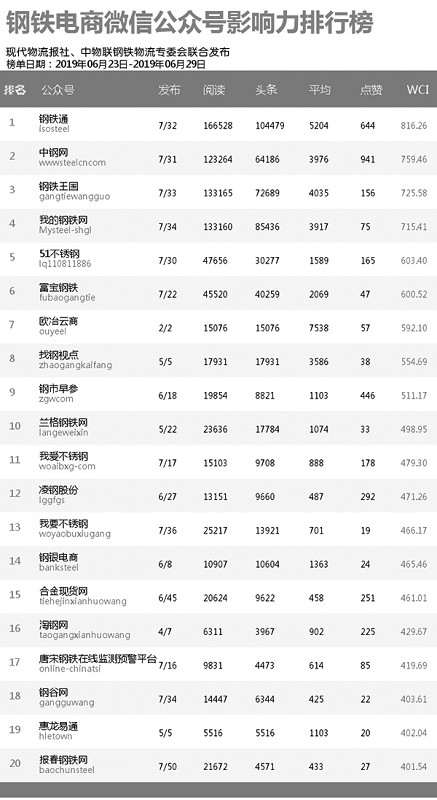钢铁行业“钢铁电商微信公众号影响力排行榜”由现代物流报社、中物联钢铁物流专业委员会联合发布。