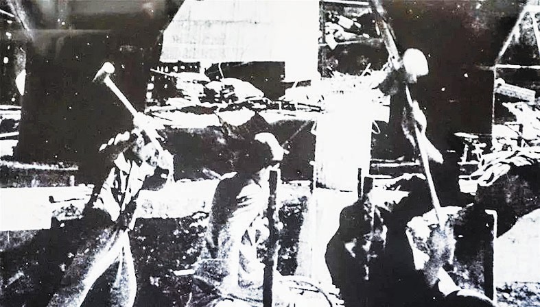 图②为鞍钢集团博物馆内展出的1949年工人修复工厂的照片