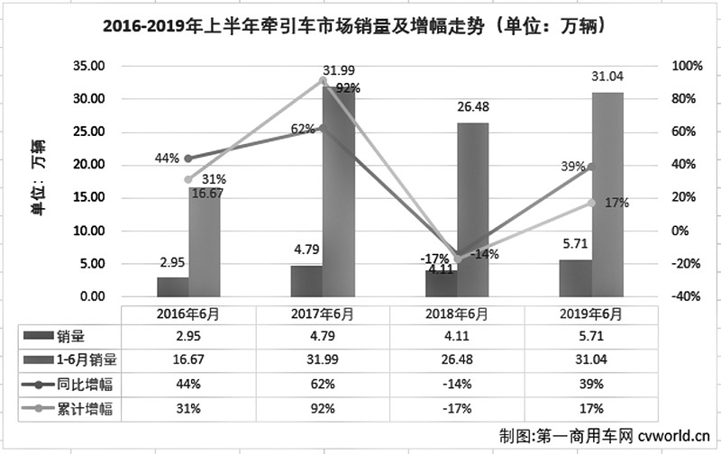 6月份,重型卡车市场销售10.37万辆,环比下降4%,同比下降7%,连续3个月遭遇下滑。而作为重卡市场的重中之重,牵引车市场并未随之下滑,在6月份交出的成绩为,销售5.71万辆,同比增长39%。至此,牵引车市场在2019年首月遭遇下滑后,已连续5个月实现增长,增幅更是呈现逐月扩大趋势(2、3、4、5月牵引车市场同比分别增长9%、16%、18%和36%)。