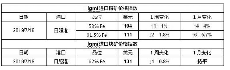 (7月15日~7月19日)本周进口铁矿石市场小幅震荡。据兰格钢铁云商平台监测数据显示,截至7月19日,58%澳粉104美元/吨,较上周上涨1美元/吨;61.5%澳粉111美元/吨,较上周下跌2美元/吨;62%澳块131美元/吨,较上周下跌1美元/吨。