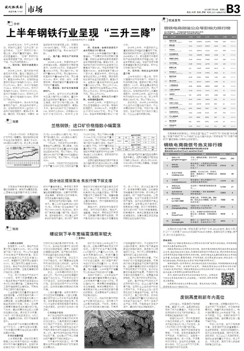 □兰格钢铁研究中心王国清 2019年已过半,对于上半年来说,钢铁行业呈现“三升三降”的运行特点,“三升”即...