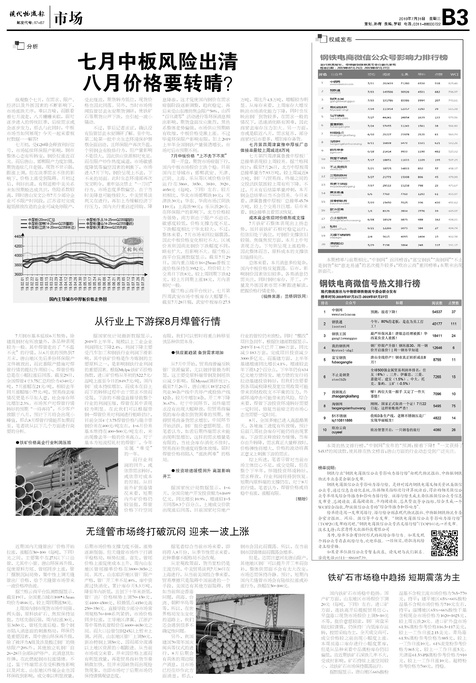 7月钢市基本延续6月颓势,除建筑钢材有所放量外,各品种表现较为一般。其中焊管走出了“不温不火”的行情,从...