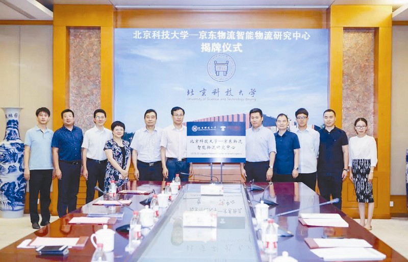 图为北京科技大学-京东物流智能物流研究中心揭牌仪式。