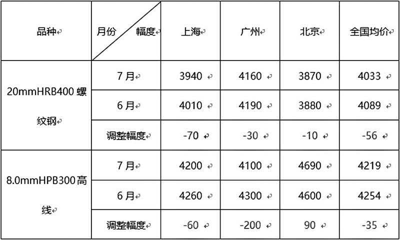 截至7月31日,上海、广州、北京三城螺纹钢价格月环比分别下跌70元/吨、30元/吨和10元/吨,华东地区跌幅相对较大。主要城市螺纹钢全国均价4033元/吨,月环比下跌56元/吨,线材全国均价4219元/吨,月环比下跌35元/吨。