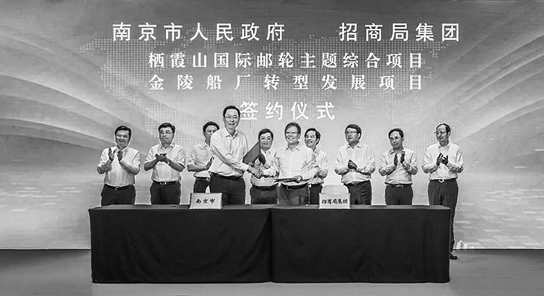 本报讯8月9日,招商局集团与南京市人民政府在江苏南京签署《关于金陵船厂转型发展合作框架协议》 《栖霞山国际邮轮主题综合项目合作框架协议》。江苏省委常委、南京市委书记张敬华,南京市委副书记、紫东地区建设指挥部总指挥沈文祖,招商局集团董事长李建红,集团副总经理王崔军等领导见证签约。集团总经理付刚峰与南京市市长蓝绍敏签署了合作协议。