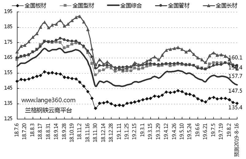 据兰格钢铁云商平台周价格预测 模 型 数 据 测 算 , 下 周(2019.8.12~8.16)国内钢材市场价格将震荡下跌,长材市场价格将继续下跌,型材市场价格将小幅下跌,板材市场价格震荡下滑,管材市场价格将震荡下滑。兰格钢铁全国钢材综合价格指数预计在147.5点附近波动,钢材均价在4060元左右,平均波动10~60元左右。其中,长材价格指数预计在157.7点附近波动,下跌1.2点;型材价格指数预计在159.4点附近波动,下跌0.9点;板材价格指数预计在135.4点附近波动,下跌0.6点;管材价格指数预计在160.1点附近波动,下滑0.3点。