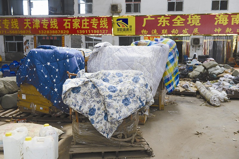19日下午,记者在东方大运物流园采访,暴雨后的痕迹依旧明显,园区内堆积着不少没有清除完的垃圾和漂浮物。“这些被子全部是新的,都是员工用的,此次全部被淹,而且被大水冲跑了100多条。这下面都是电视机、电脑等,也都全部受损。”耿开学手指着两堆纸箱和上面晾晒的被子,表情十分凝重。