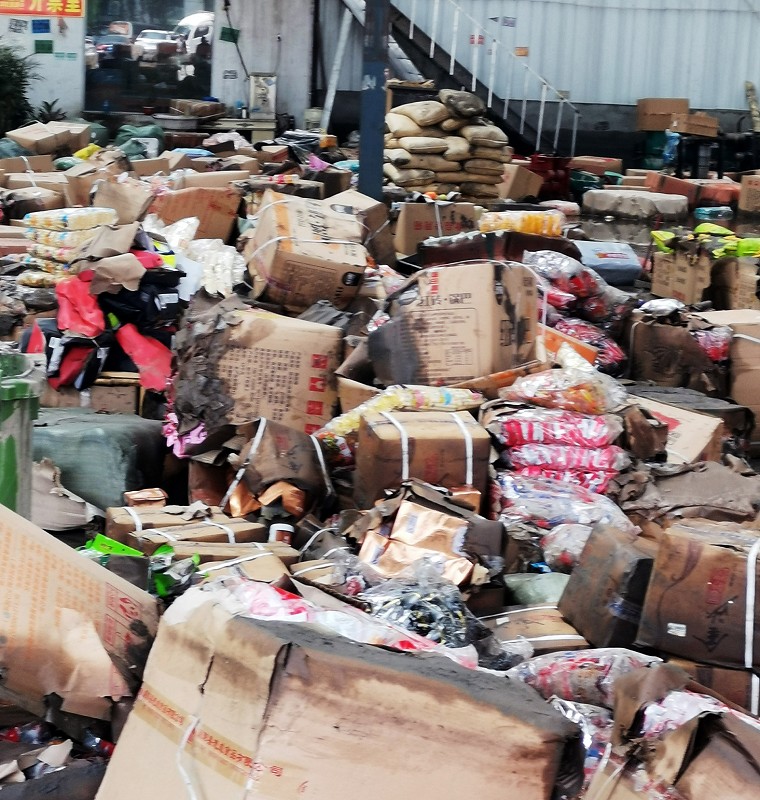 在坤乾道通物流的仓库内,记者看到,到处堆满了被水浸泡的票据,破损的承运货物散落一地。办公室里,大水褪去后的痕迹依然清晰可见,墙体上一米左右的水泡痕迹依旧清晰,办公室里杂乱无章地堆放着各种办公物品。