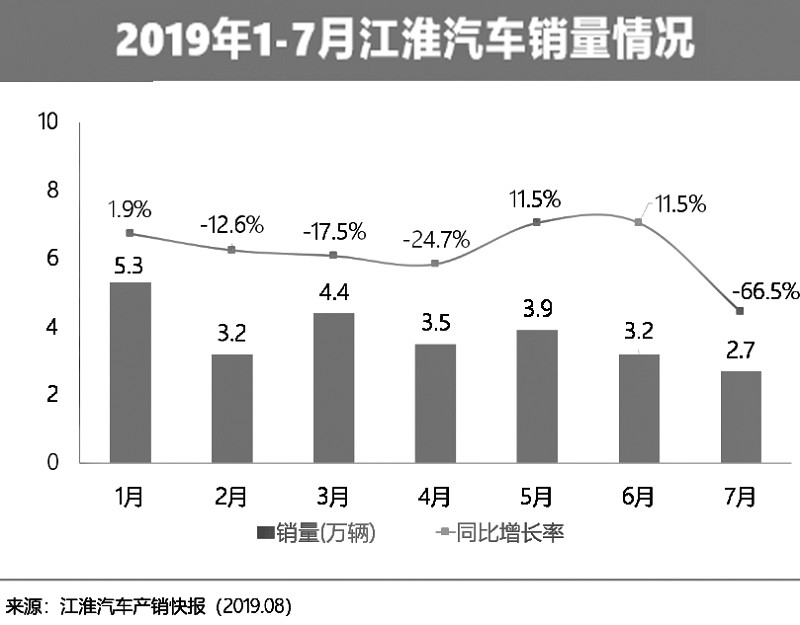 2019年上半年,江淮销售各类汽车及底盘23.52万辆,同比下降6.78%。其中,轻型货车(含中型货车)10.90万辆,同比下降7.37%;重型货车销售2.18万辆,同比下降16.32%。