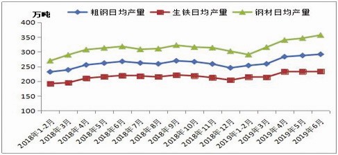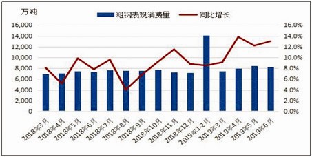 二是2019年6月全国粗钢产量8753.3万吨,同比增长10.0%;2019年1~6月,全国粗钢产量4.92亿吨,同比增长9.9%。这有去年同期关停地条钢的产量同比统计问题,但是也有去年底和今年上半年政府3万亿增加投资带来钢铁需求创新高和实际钢铁需求增长问题。今年这个粗钢产量统计数字是真实的,上半年钢铁需求快速增长刺激了新一轮钢铁产能扩张。
