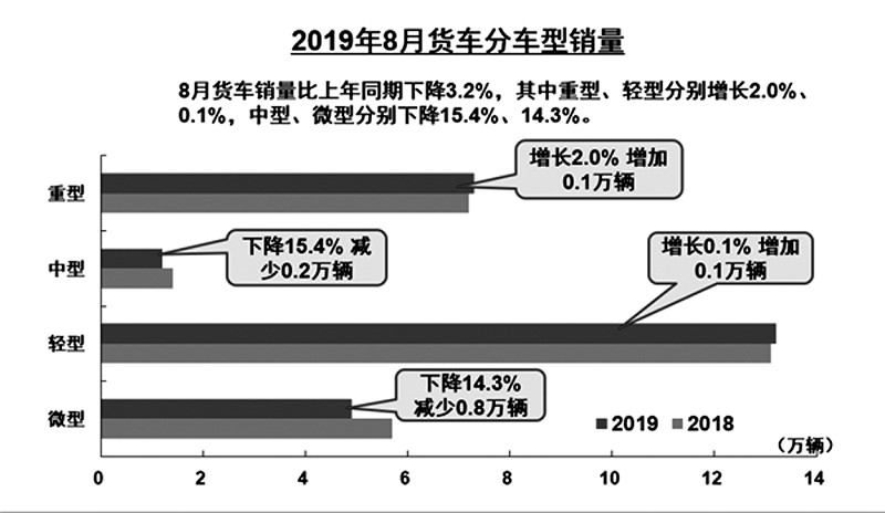 8月货车销量比上年同期下降3.2%。其中,重型货车产销分别完成7.2万辆和7.3万辆,比上年同期分别增长7.7%和2.0%;轻型货车销量达到13.2万辆,与去年同期相比微弱增长0.1%;中型货车销量完成1.2万辆,与去年同期相比下降15.4%;微型货车销量达到4.9万辆,与去年同期相比下降14.3%。