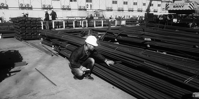 图为河钢销售雄安分公司业务经理李睿正在雄安站工地提供现场直供服务。