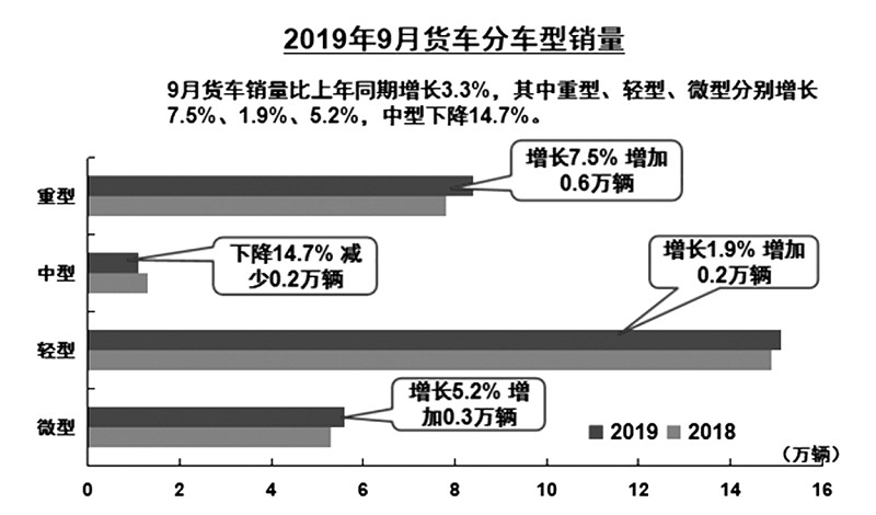 9月货车销量比上年同期增长3.3%。其中,重型货车销量同比增长7.5%,增加0.6万辆;轻型货车销量同比增长1.9%,增加0.2万辆;微型货车同比增长5.2%,增加0.3万辆;中型货车销量同比下降14.7%,减少0.2万辆。